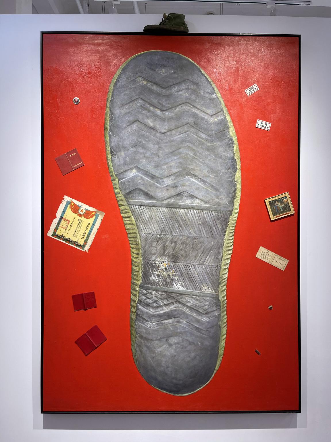 艺术家杨烨炘这幅油画,思考的是一个老兵的一生。这世上有过千千万万人民解放军,能被叫出名字的是极少数,绝大多数奉献一生,有名有姓但默默无名。今日的和平盛世,是他们留给这个世界的共同痕迹,但他们个人的足迹却鲜为人知。这也是为什么艺术家将目光倾注在老兵的鞋底。它不仅记录着老兵的身体状况,更记录着他走过的路、守过的疆、得过的奖、谋过的生……它是老兵人生轨迹的承载,是随身携带的存在印记,并仍在继续。它平时不被看到,不起眼甚至有时不入眼,正是老兵一生的写照。也因此,艺术家以数十倍于实际鞋底的两米画幅,将老兵一生呈现在世人面前,并以综合材料与油画结合的方式,将其平凡与不平凡娓娓道来。