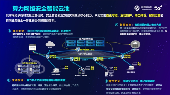 当前,算力已成为支撑数字经济持续纵深发展的重要动力,保障算力网络安全尤为重要。针对网络安全底座“卡脖子”、算力节点安全性不足、算力安全防护弹性不足、算力安全保障智能化不足等算网安全性挑战,中国移动充分发挥网络承载和流量运营优势,打造自主可控、主动防护、动态弹性、智能运营的算网业务安全一体化安全保障服务体系。