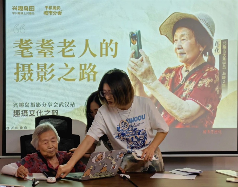 88岁学员莲花(左一)分享在兴趣岛学手机摄影心得