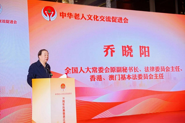 10月27日下午,庆祝中华老人文化交流促进会成立35周年暨浙江省办事处成立大会在浙江宁波南苑环球酒店隆重举行。全国人大法律委员会原主任、香港、澳门基本法委员会主任乔晓阳出席大会并讲话。