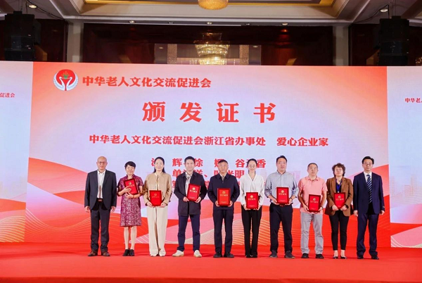 会上,中华老人文化交流促进会浙江省办事处领导给爱心企业家颁发荣誉证书。