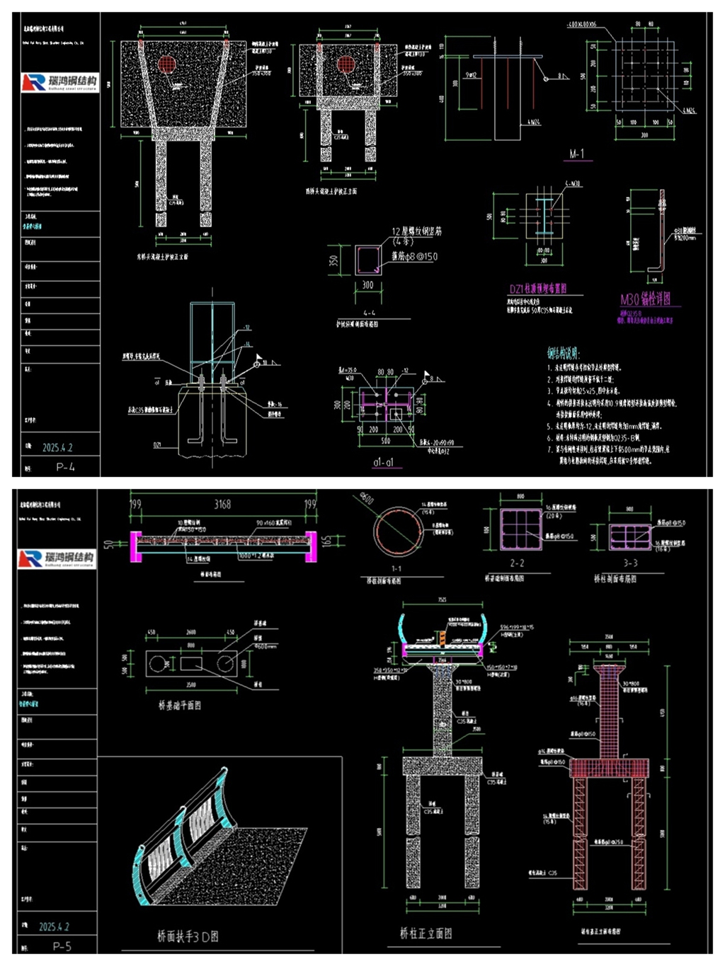乡村跨河钢结构桥部分设计图。陈柏材绘