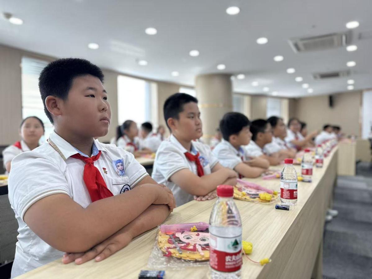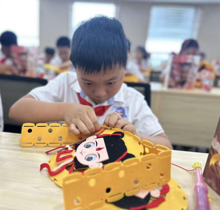 科技探秘后,报告厅变身传统手工坊。在老师指导下,孩子们将竹篾弯折、红纱轻覆,一盏盏哪吒主题灯笼渐次亮起。“哪吒用混天绫守护百姓,我们也要用科技守护传统文化。”张昊洋边说边为灯笼绘上金色纹样。指尖流转间,神话英雄的浩然正气与当代少年的文化自信悄然交融。