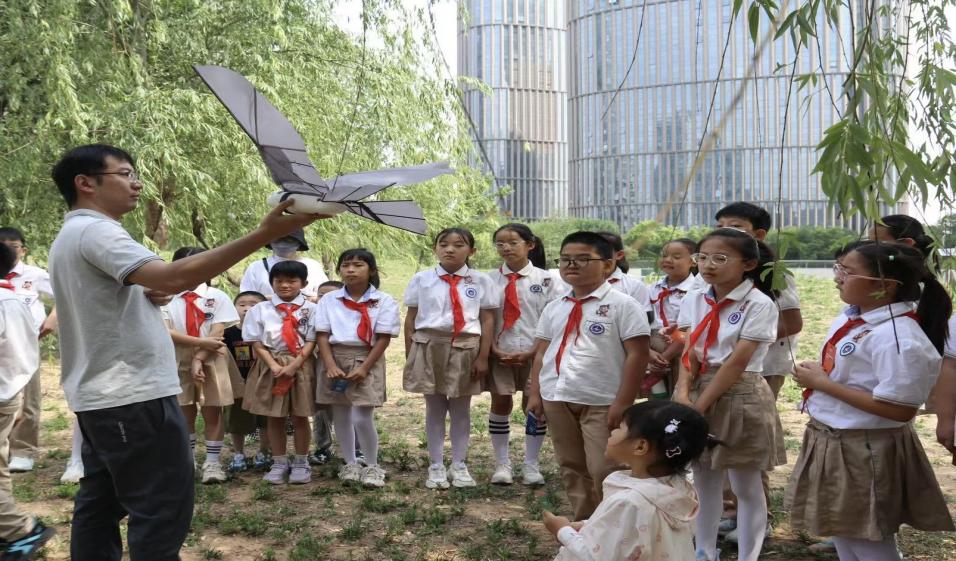 移步园区,科技研发人员操控的仿生鸟凌空盘旋,其逼真姿态引发阵阵欢呼,学生们沉浸其中,久久不愿离去。