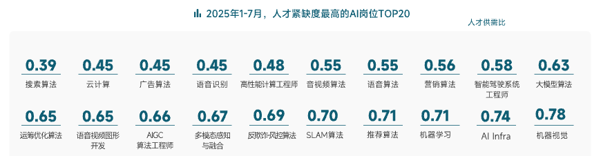 中国日报9月18日电 (记者 李佳颖)根据国内招聘平台脉脉最新发布的《2025年AI人才流动报告》,2025年1-7月,AI领域人才市场供需两旺,AI新发岗位量同比增长超10倍,简历投递量也暴涨了11倍。“算法”相关人才持续紧缺,其中“搜索算法”人才紧缺度最高,5岗争2人。非技术岗数量同比增长7.7倍。AI人才争夺战延伸至校招,脉脉上过半应届生岗位月薪超5万。