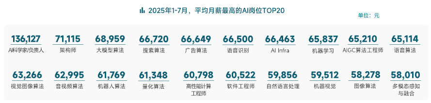 2025年7月,AI相关新发岗位数量同比增长超过10倍,简历投递量同比增长11倍。薪酬也水涨船高,2025年1-7月,AI新发岗位平均月薪达到61,475元,较2024年同期的58,921元上涨4.33%。