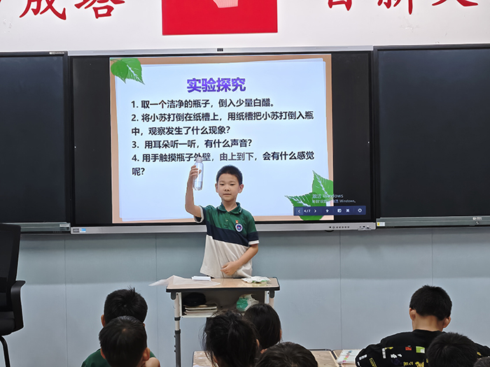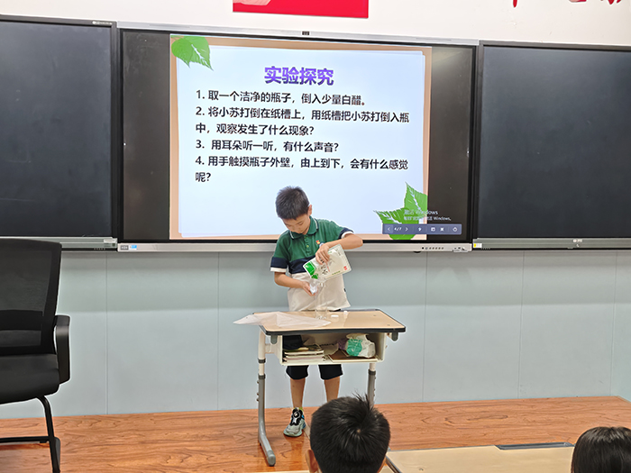 凌子铭同学给大家展示的是“小苏打与白醋的化学反应”。他按照实验步骤,先在瓶中倒入白醋,再用纸槽将小苏打送入瓶内。瞬间,瓶中产生大量气泡,发出“滋滋”的声响。他引导大家用耳朵听、用手触摸瓶壁,“大家有没有感觉到瓶子上部有点凉?这是因为化学反应吸收了热量哦。”专业的讲解、规范的操作,很难想象这出自二年级学生之手。