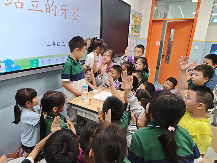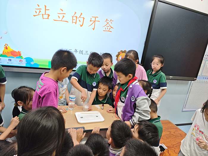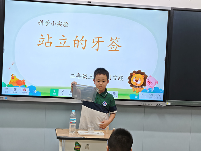 瞧,刘言蹊同学正在演示“立起来的牙签”实验。他将洗洁精加入清水中搅拌出泡沫,再把牙签放入其中,原本难以直立的牙签竟稳稳“站”了起来。他站在大屏幕前,清晰地讲解原理:“洗洁精泡沫提供了弹性支撑和平衡浮力,让牙签克服了重心不稳的问题。”台下同学围聚在实验桌旁,睁大眼睛观察,有的还忍不住伸手尝试,教室里充满了探索的热情。