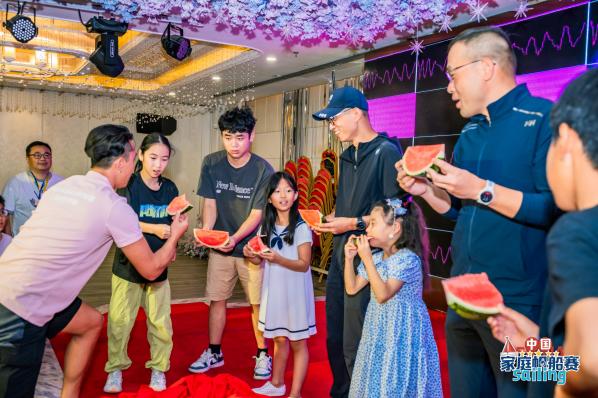 家帆赛的魅力远不止于赛场。在“水手之夜”晚宴上,仲裁长与各船队分享了比赛案例,选手们也纷纷上台一展才艺。在热烈的“吃西瓜比赛”中,裁判、教练和选手们放下形象,笑声连连,将天南地北的距离瞬间缩短,都融汇在家帆赛这个大家庭里,将亲情与欢乐,深深印刻在每个参与者的金秋记忆里。