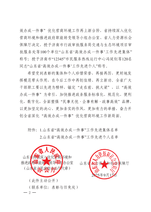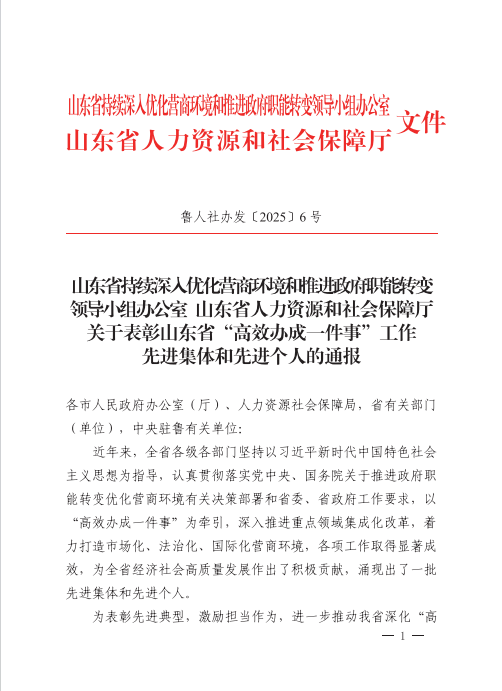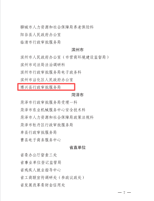 近日,山东省持续深入优化营商环境和推进政府职能转变领导小组办公室与山东省人力资源和社会保障厅联合下发《关于表彰山东省“高效办成一件事”工作先进集体和先进个人的通报》,博兴县行政审批服务局凭借在政务服务改革中的创新举措和卓越成效,荣获山东省“高效办成一件事”工作先进集体称号。