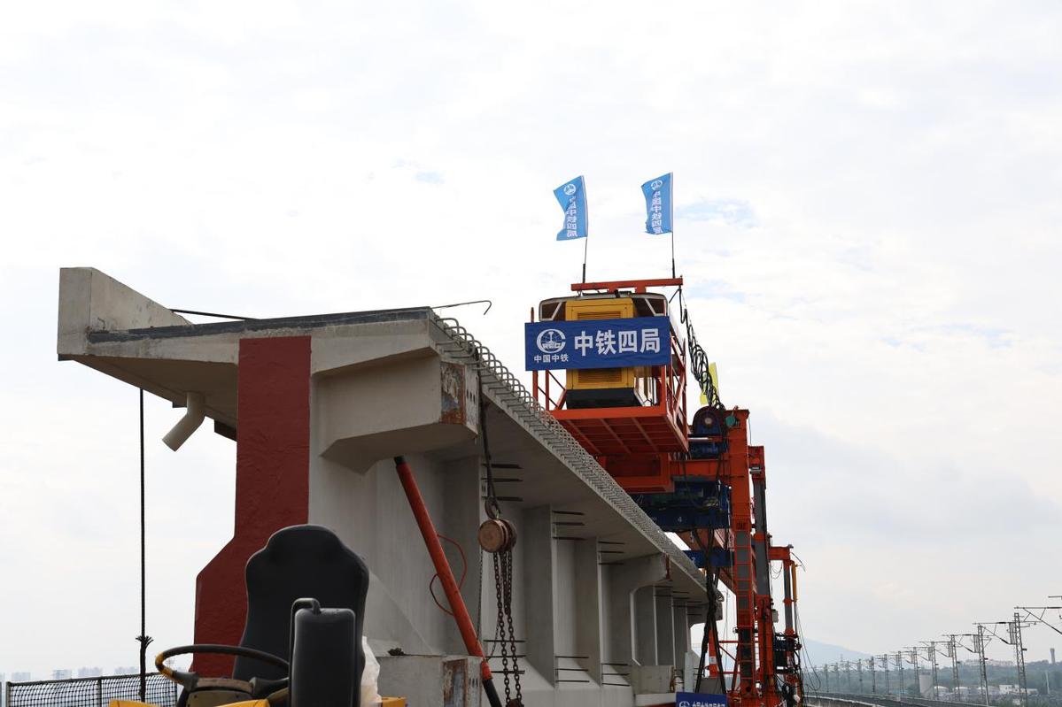 本次架设的首孔T梁位于由中铁四局承建的龙烟铁路市域化改造工程施工2标段,该孔梁长32.6米,单片梁重134.3吨,采用DJ180型公铁两用架桥机架设。这款架桥机是集提梁、运梁、架梁功能于一体的专用设备,能够实现机械化、自动化作业,工序衔接紧密,架梁速度、安全系数和经济性均远优于传统工艺,适用于后续多跨长桥的规模化施工。中铁四局龙烟铁路市域化改造工程施工2标段项目建设团队坚持创新引领、技术先导,引入了架桥机整机姿态监控系统,可同步显示机身水平稳定度和实时工况,实现远程影像反馈,并加装防碰撞雷达系统,能实时监测周边30米内障碍物,确保架梁工程安全高效推进。
