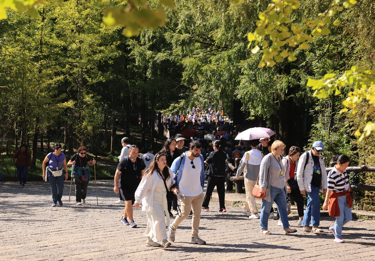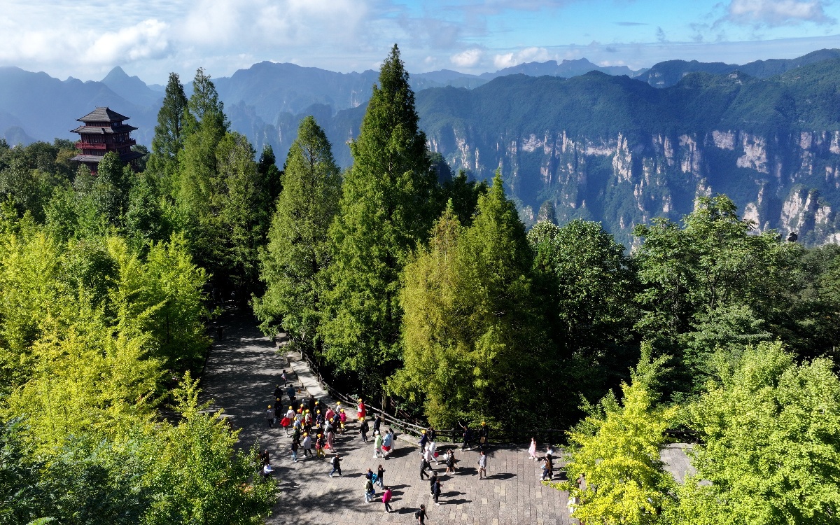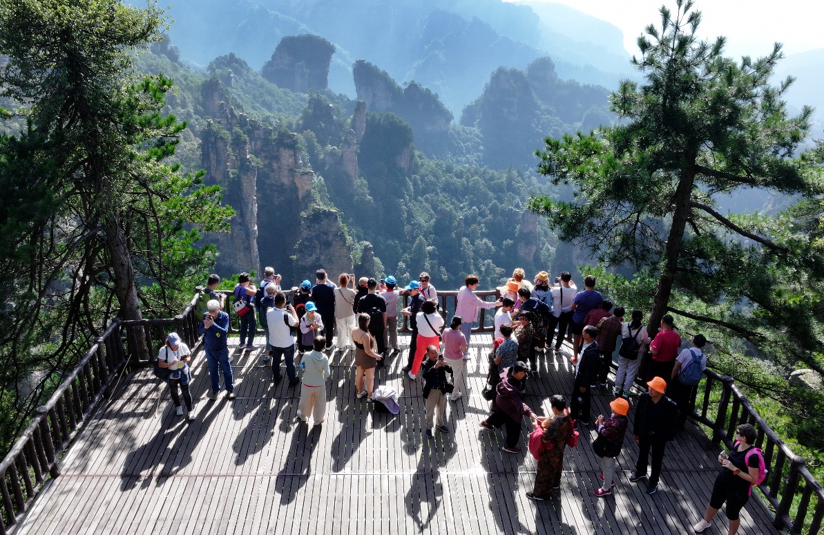 中国日报9月26日张家界讯 随着国庆、中秋双节的临近,湖南张家界国家森林公园天子山景区迎来“秋游黄金季”,秋高气爽的宜人气候与奇美的自然风光相得益彰,吸引了中外游客前来观光游览。