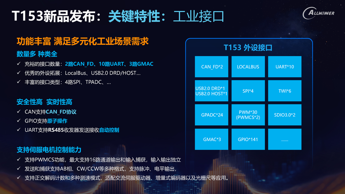 基于这些洞察,全志科技顺势推出了T153。作为一款专为工业场景打造,可被广泛应用于PLC、HMI、工业网关等工业应用的芯片,T153具备了面向智慧工业需求打造的可靠算力、高扩展性及开放的软件生态。
