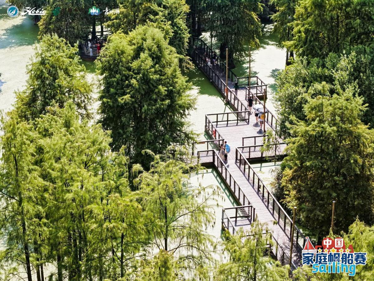 本次比赛的赛场位于青山湖水上森林景区,景区拥有100万平方米国内罕见的水上森林,是临安生态与文旅的“金名片”。赛事期间,景区开通游船观赛服务,既能近距离观看帆船竞速,又能将青山湖“水杉映湖、鹭鸟低飞”的生态美景尽收眼底。沿湖绿道上,观赛点位标识清晰,不少市民带着野餐垫驻足,为湖面参赛家庭加油,沉浸式感受赛场热烈氛围。青山湖水上森林景区负责人表示:“家帆赛让‘旅游+体育’有了新玩法,百亩水上森林不仅是风景,更成了传递健康生活理念的赛场。未来我们会继续联动这类赛事,让更多人感受青山湖的生态之美与运动之趣。”