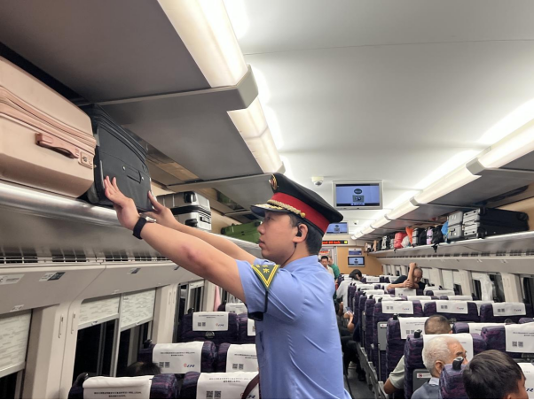 列车长史文杰如同往常一样,在值乘途中细致地巡视着每一节车厢。他一边熟练地整理着行李架,确保旅客行李安放稳妥、通道畅通无阻;一边认真检查列车上的消防器材、电茶炉等重点设备部位,将安全行车与旅客平安始终放在首位。车厢内,整洁的环境和有序的秩序,为旅客营造了舒适安心的旅途氛围。