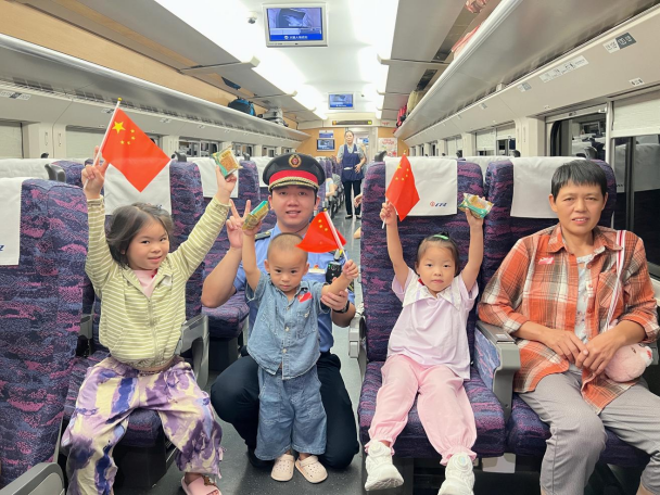 “小朋友,国庆节快到了,送你这面小国旗,让我们一起祝福祖国好不好?”史文杰亲切地俯身说道。孩子们手捧国旗,脸上绽放出纯真而惊喜的笑容,迫不及待地将国旗贴纸贴在胸前或手背上。一时间,小小的车厢里,红色的旗帜与孩子们的笑脸交相辉映,浓浓的爱国情与节日喜悦在空气中流淌。
