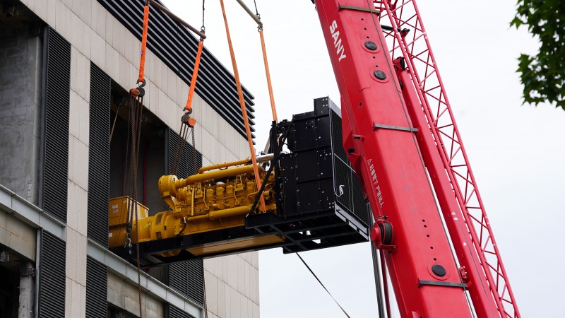 项目团队创新采用“数字化预吊装”方案,通过BIM技术反复模拟,为每台设备规划出独一无二的“迁徙路线”。当700吨级的重型吊机舒展长臂,如同一位沉稳的巨匠,将数十吨重的机组轻握手中,在有限空间内精准完成平移、旋转与落位。特别是在柴油发电机组“钻窗”入室的环节,项目团队更是展现出毫米级的操作艺术,确保所有设备100%一次吊装成功,施工时间较预期缩短20%,为这座“金融数据堡垒”注入了强劲的动力之源。