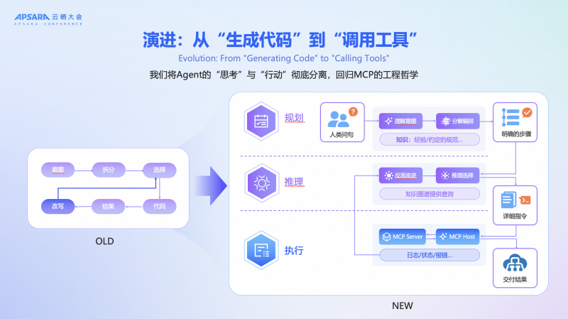 面对挑战,程哲桥带领的团队提出并实践了一条从“AI Coding”到“智能MCP”的演进之路。其核心思想,是借鉴“关注点分离”的软件工程原则,将原先一体化的Agent,解构为规划、推理、执行三个独立的层次,使系统更加清晰、可维护。
