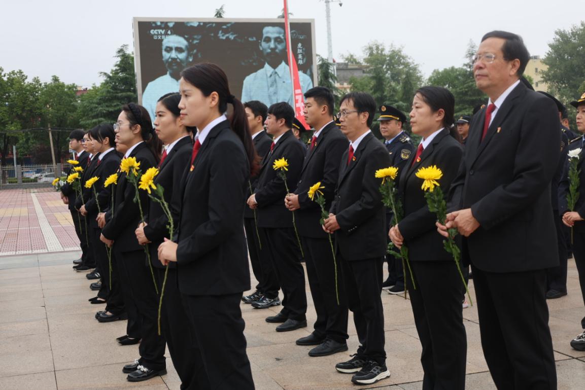 仪式上,干警们着装整齐,向革命烈士鞠躬默哀,深切缅怀革命先烈的丰功伟绩,向浴血奋战、保家卫国的英雄烈士表达崇高敬意和无限哀思。随后,参加公祭的全体人员依序上前向烈士敬献鲜花,缓步绕行瞻仰纪念碑,表达对革命先烈的无比敬仰和缅怀之情。