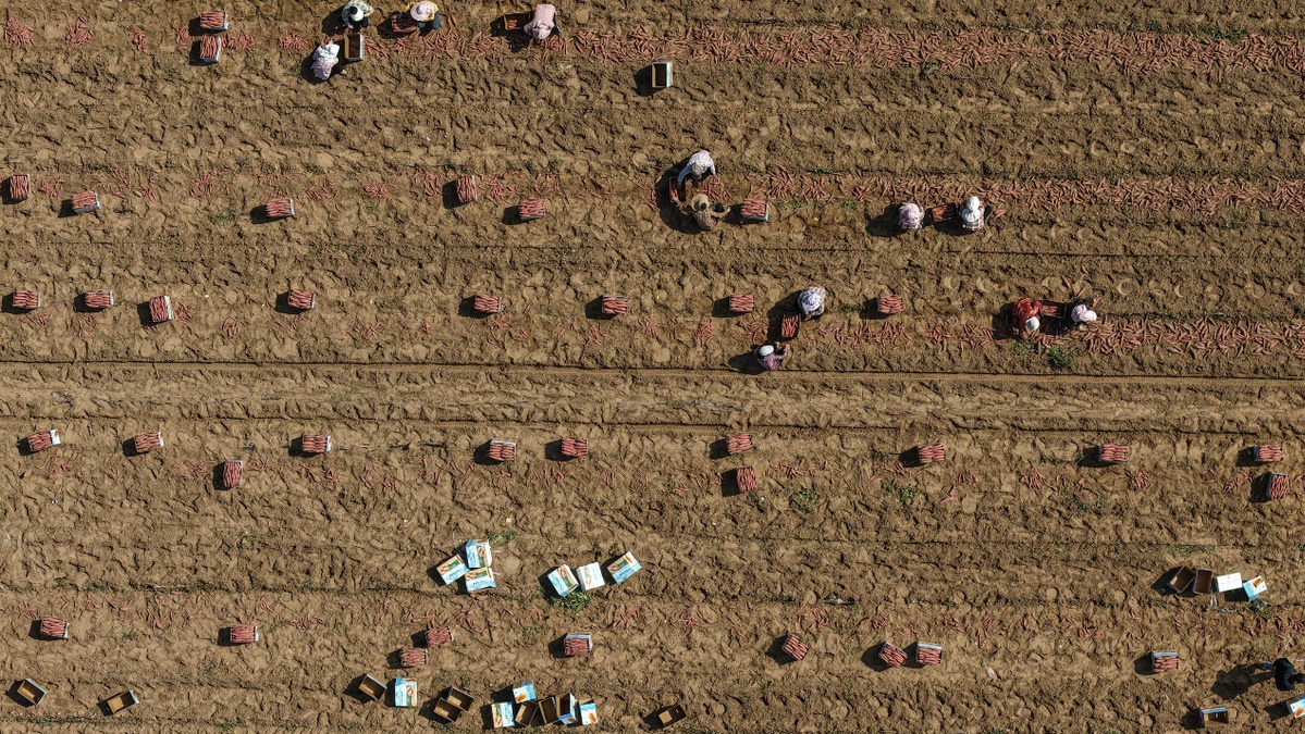 (清丰县韩村镇西刘庄村的农民在田间收获蜜薯)