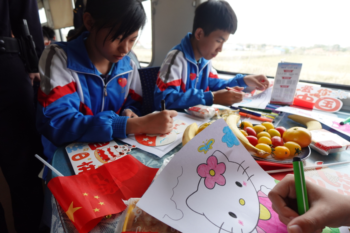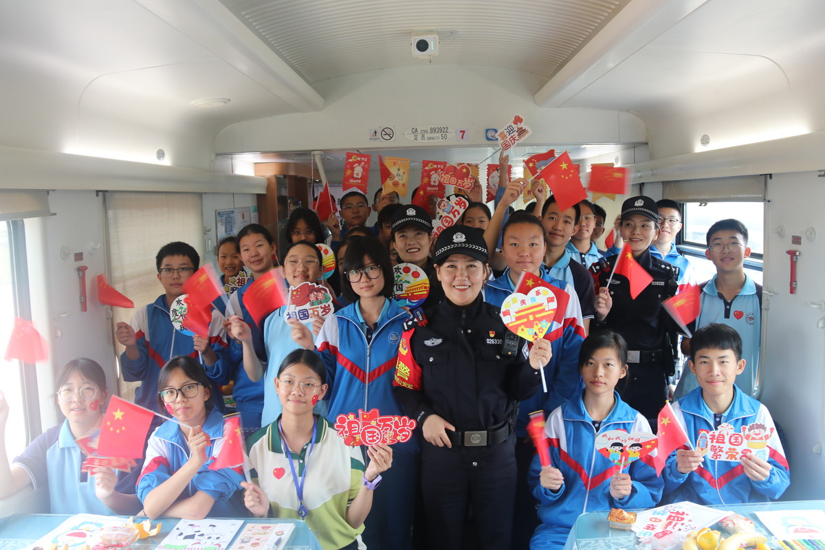“旅途有限,梦想无垠!很开心能和同学们一起在列车上为祖国庆生,让我们一起祝愿伟大的祖国,繁荣昌盛!”。9月27日,将“草原明珠”海拉尔与“渤海明珠”大连相连的K2084次“明珠号”研学专列,载着刚刚结束“滨海求知”之旅,来自海拉尔素质教育实践中心的460名师生,驶向家乡,海拉尔铁路公安处“艾音卓拉”乘警组与研学师生在列车上“欢度国庆”,与旅客们共同表达对祖国母亲的美好祝愿。