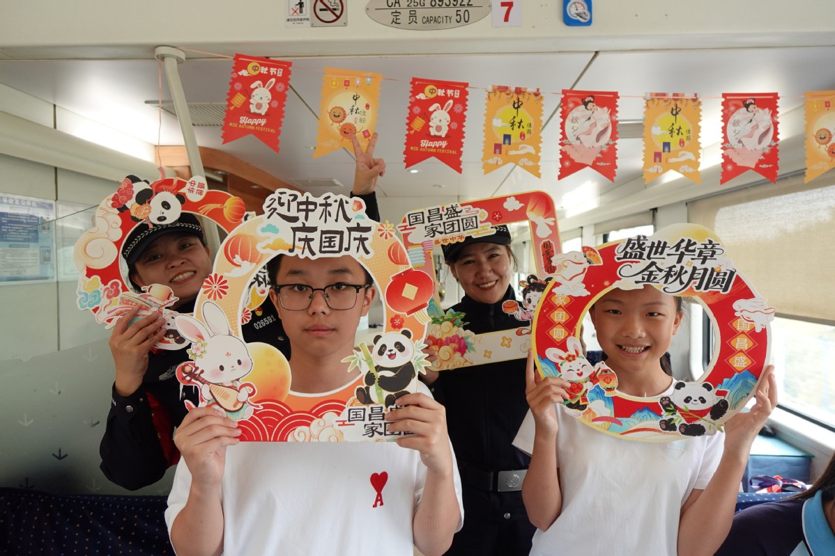 “这是我第一次在火车上感受过节氛围,没想到这么热闹!”来自研学学生武曾轩手捧着乘警姐姐送上的月饼,脸上洋溢着开心的笑容。车厢里,五彩条幅高高挂起,中秋国庆主题的手卡在手中挥动,浓浓节日氛围扑面而来,大家纷纷拍照留念,记录下这激动难忘的时刻。