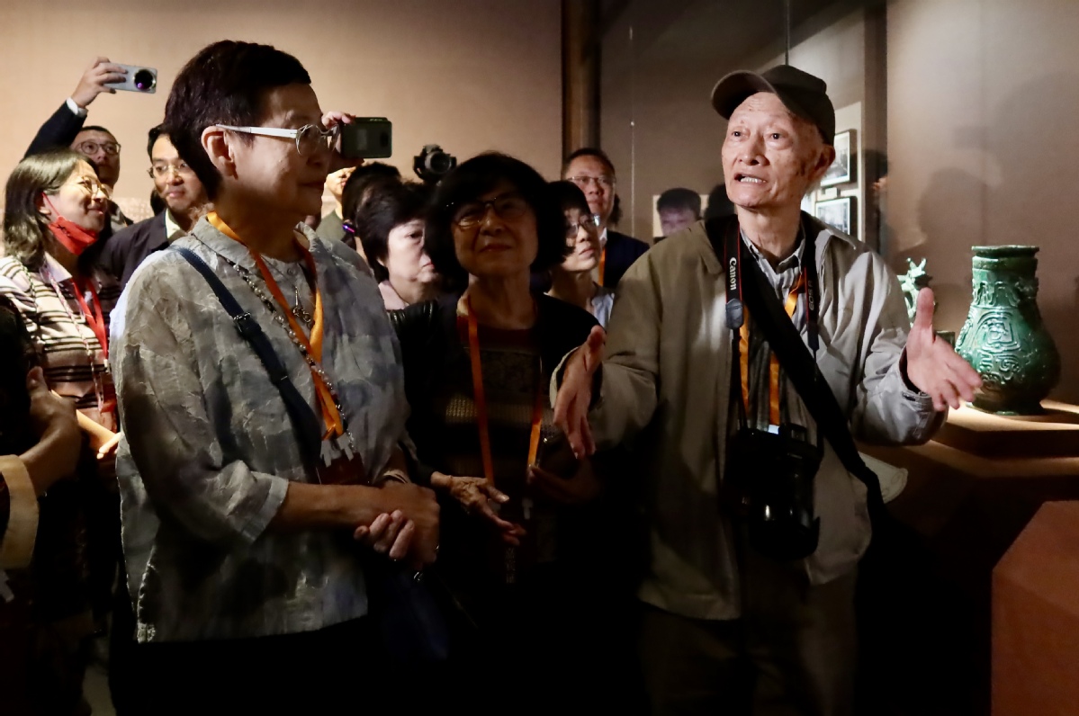 台北故宫博物院原副院长庄严之子庄灵(右一)讲述陈列展品。中国日报记者 姜东 摄