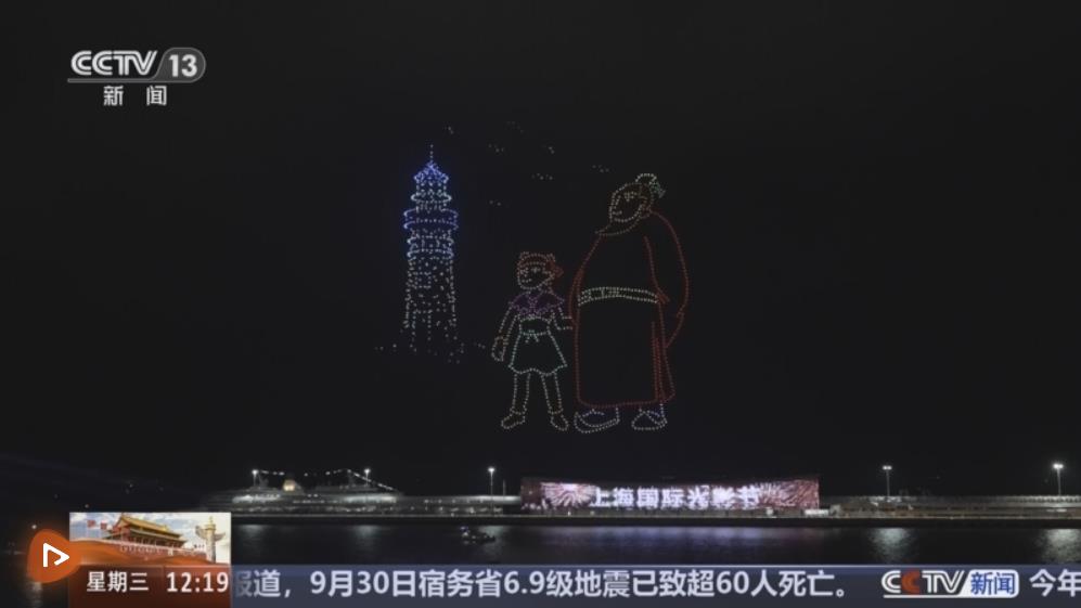 9月30日晚,为庆祝中华人民共和国成立76周年,一场大型光影烟花秀在上海吴淞口滨江上演。伴随着交响乐,千架无人机缓缓升起,在夜空中汇聚成“欢度国庆”“哪吒闹海”等图样。光影秀之后,绚烂的烟花点亮夜空。