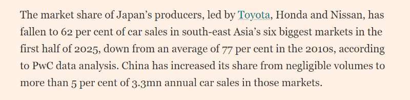英国《金融时报》日前聚焦了中国电动汽车在东南亚市场的快速发展。报道指出,中国平价电动汽车销量的飙升,打破了日本汽车制造商数十年来对东南亚市场的垄断。报道援引普华永道的数据分析指出,2025年上半年,以丰田、本田和日产为首的日本汽车制造商在东南亚六大市场汽车销量中的份额已从21世纪10年代的平均77%降至62%,而中国在这些市场中的份额则从微不足道上升至5%以上。