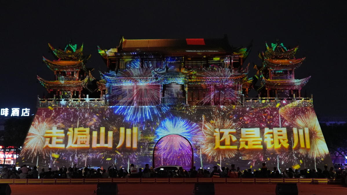 当“月满初照”篇章开启,整场诗会迎来高潮。“天幕为卷 汉印千年”无人机烟花秀惊艳夜空,数百架无人机在空中勾勒出玉皇阁、西夏陵等图案,搭配绚烂绽放的烟花,将银川老城的夜空装点成流动的画卷;舞蹈《嫦娥奔月》轻盈灵动,独唱《望月》歌声悠扬,朗诵《我的银川》《月光下我要写一首诗》《中秋月圆思念长》,则用文字与声音勾勒出银川的烟火气与中秋的温情,引发全场共鸣,全体演员共同演绎的《兴庆礼赞》更是将现场氛围推向顶点,字里行间满是对兴庆区历史文化与今日发展的赞美。