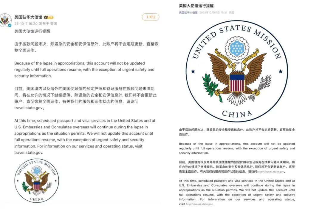 据《环球时报》此前报道,北京时间10月3日下午1时23分,美国驻华使领馆在美国社交平台X上的官方账号上宣布,由于拨款问题未解决,除紧急的安全和安保信息外,此账户将不会定期更新,直至恢复全面运作。