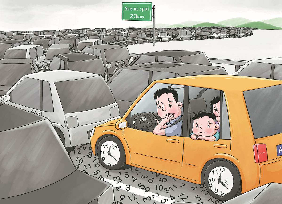 双节旅游火爆,景区拥堵现象普遍是。(来源:中国日报 郝延鹏 英文《中国日报》2025年10月9日8版)