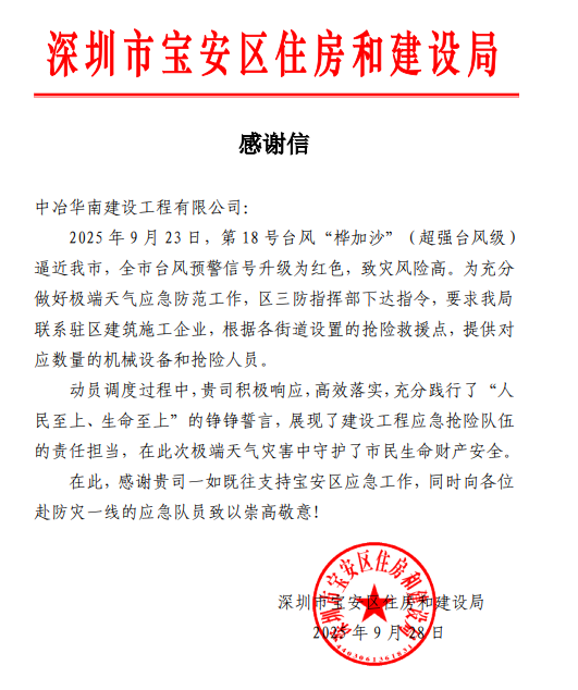 9月28日,深圳市宝安区住房和建设局向中冶华南公司发来感谢信,对公司在此前第18号超强台风“桦加沙”防御应对中的迅速响应与有力支援表示高度肯定与衷心感谢。