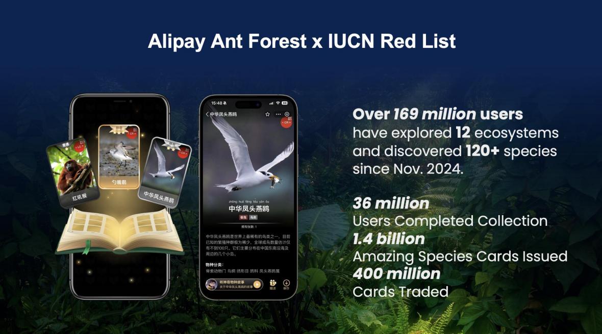 蚂蚁集团资深副总裁、首席可持续发展官彭翼捷在大会现场介绍,自IUCN与蚂蚁森林神奇物种合作以来,共上线海洋特辑、候鸟特辑、珊瑚特辑等12期特辑,介绍了120个濒危物种,累计吸引了1.69亿人次参与活动,领取濒危物种卡牌14亿张。“这些卡片不仅让用户了解到濒危物种的状况,还帮大家与自然界建立起情感联系,从而对大自然产生更强的责任感”,彭翼捷说。