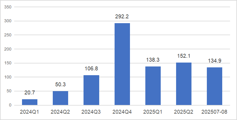 图1:银登中心消金个贷不良挂牌转让规模走势(2024年1月—2025年8月;单位:亿元)