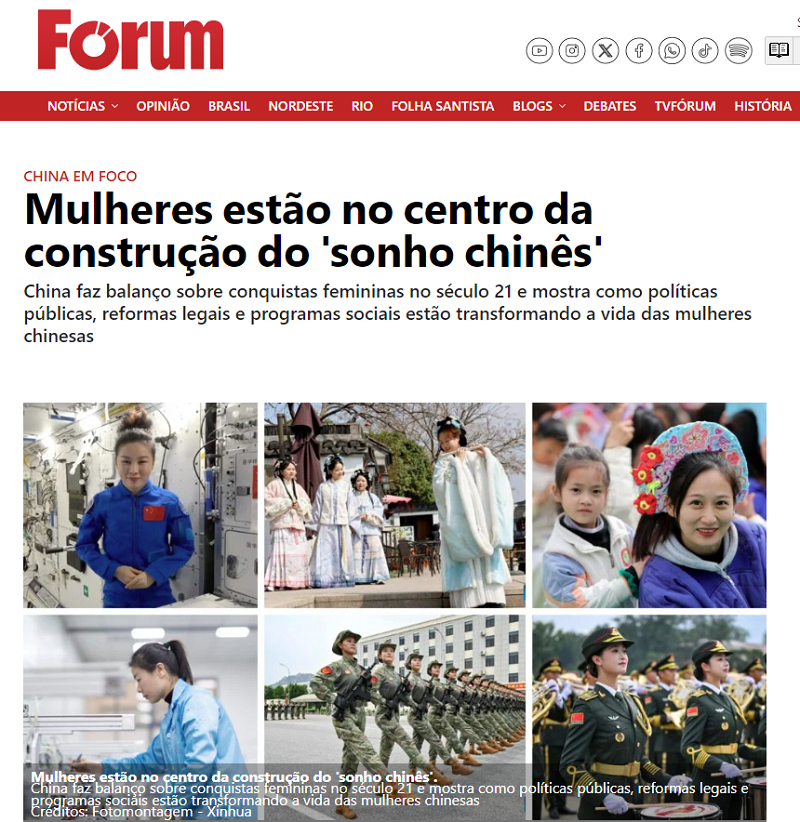 巴西《论坛》杂志网站近日刊文称,女性是构建“中国梦”的核心力量,中国女性现在拥有如此多的机会去发挥她们的潜力,实现她们的梦想。