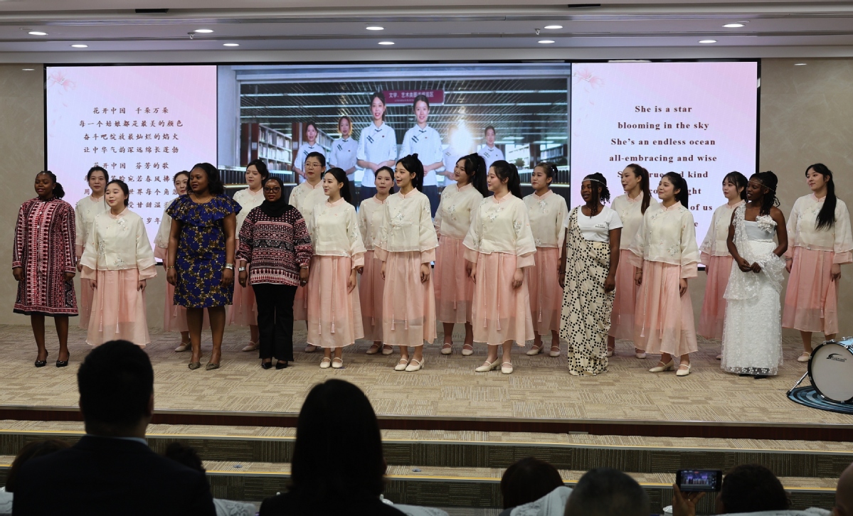 中华女子学院中外学生演唱主题歌曲《花开中国》。中国日报记者 王壮飞 摄