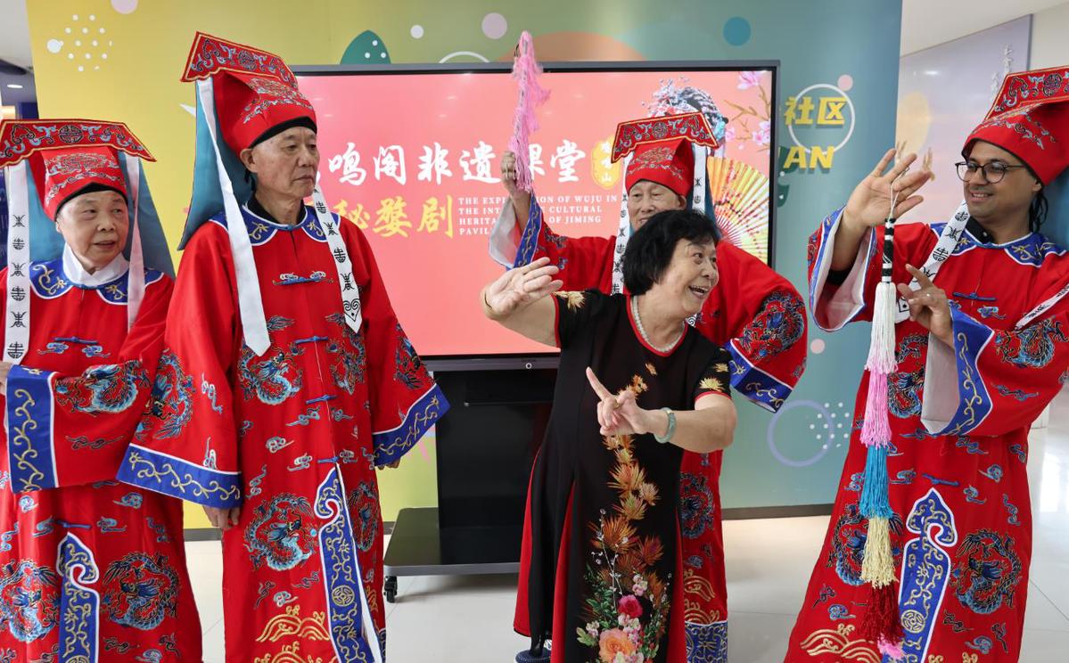 社区组织中外居民学习婺剧经典选段。参与者在一板一眼的模仿中,感受这一国家级非遗的独特魅力,让传统戏曲在乡音袅袅中焕发新生。一位参与活动的也门居民哈森感慨:“以前听到社区里的叔叔阿姨们哼唱,现在自己来学,感觉特别亲切,这才是中国自己的‘流行歌曲’。”现场气氛热烈,老戏迷们韵味十足的演唱与初学者略显生涩却充满热情的跟唱交织在一起,勾勒出一幅乡音袅袅、文化传承的生动画面。
