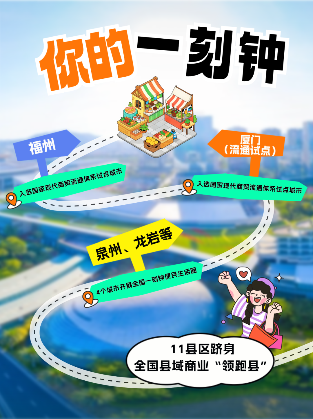 幸福,就是出门步行15分钟内,解决生活所需。如今,福州、厦门正打造全国一流的商贸流通体系,泉州、龙岩等城市在构建“一刻钟便民生活圈”,全省还有11个县区成为了全国县域商业的“优等生”。
