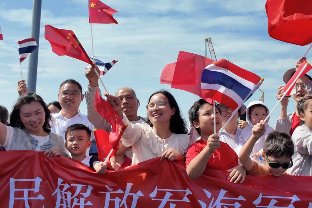 当地时间早上7时,戚继光舰和沂蒙山舰抵达指定海域,与泰国“象岛”号登陆舰汇合,中泰双方官兵用旗语互致问候。随后,三舰组成编队行进,驶向梭桃邑港。10时许,悬挂中泰两国国旗的戚继光舰、沂蒙山舰缓缓靠港,编队官兵分区列队,向欢迎人群挥手致意。港岸码头,中国驻泰国大使张建卫和使馆人员以及中资机构、华侨华人代表、中泰青年代表、泰国皇家海军等1700余人在码头迎接,并举行了隆重的欢迎仪式。当地中小学学生手持中泰两国国旗和中泰友好标语,热烈欢迎中国海军舰艇编队来访。