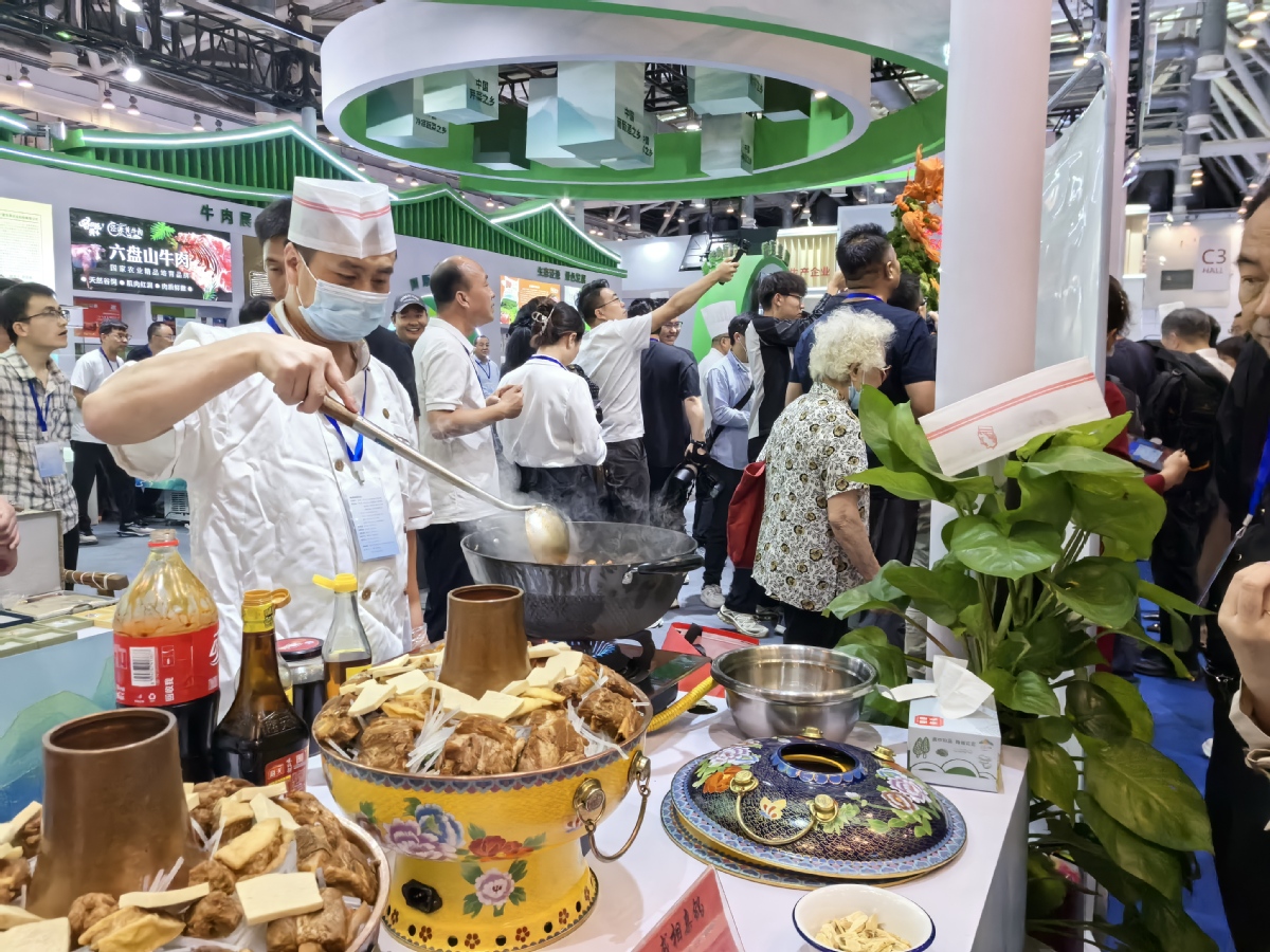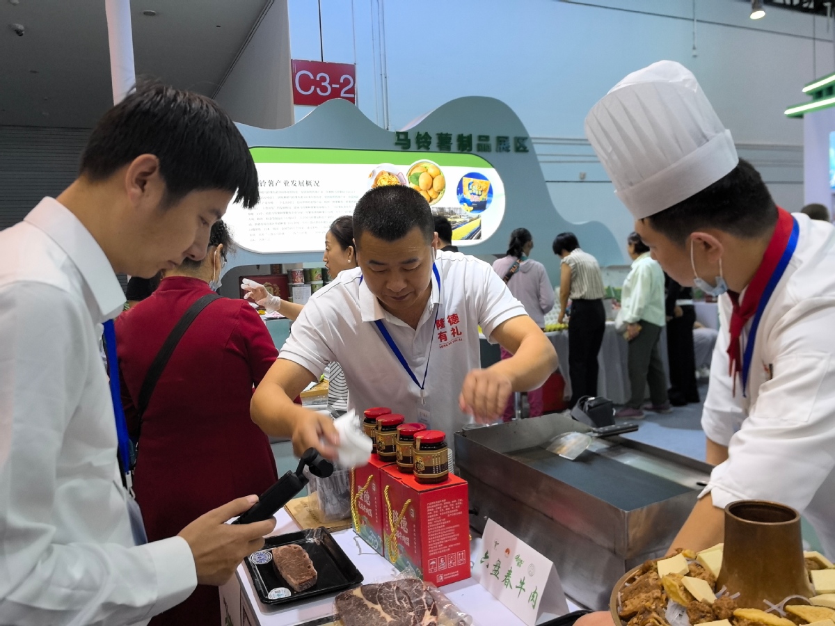 推介会现场,六盘山农特产品展台前挤满了尝鲜的宾客。刚切好的牛肉片纹理清晰,蘸上简单的调料便鲜味十足;包装精美的马铃薯粉条,被现场烹饪成酸辣粉,酸香扑鼻引得人驻足。