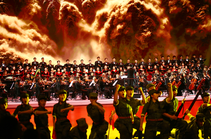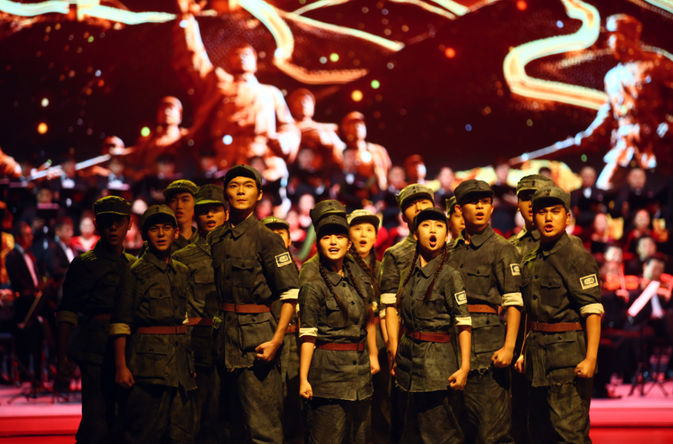 胜利之声篇章,中国传媒大学教师李立宏、延安革命纪念馆馆长刘妮、演员胡军、郭京飞等通过朗诵、讲述、情景演绎等方式,重温进步青年奔赴延安、团结抗战的动人场景,再现延安时期经典曲目背后的创作故事。西安交响乐团、西安交响乐团合唱团、延安大学鲁艺合唱团与全场观众共同唱响《抗日军政大学校歌》《保卫黄河》《军民大生产》《团结就是力量》,共上一堂音乐大思政课。