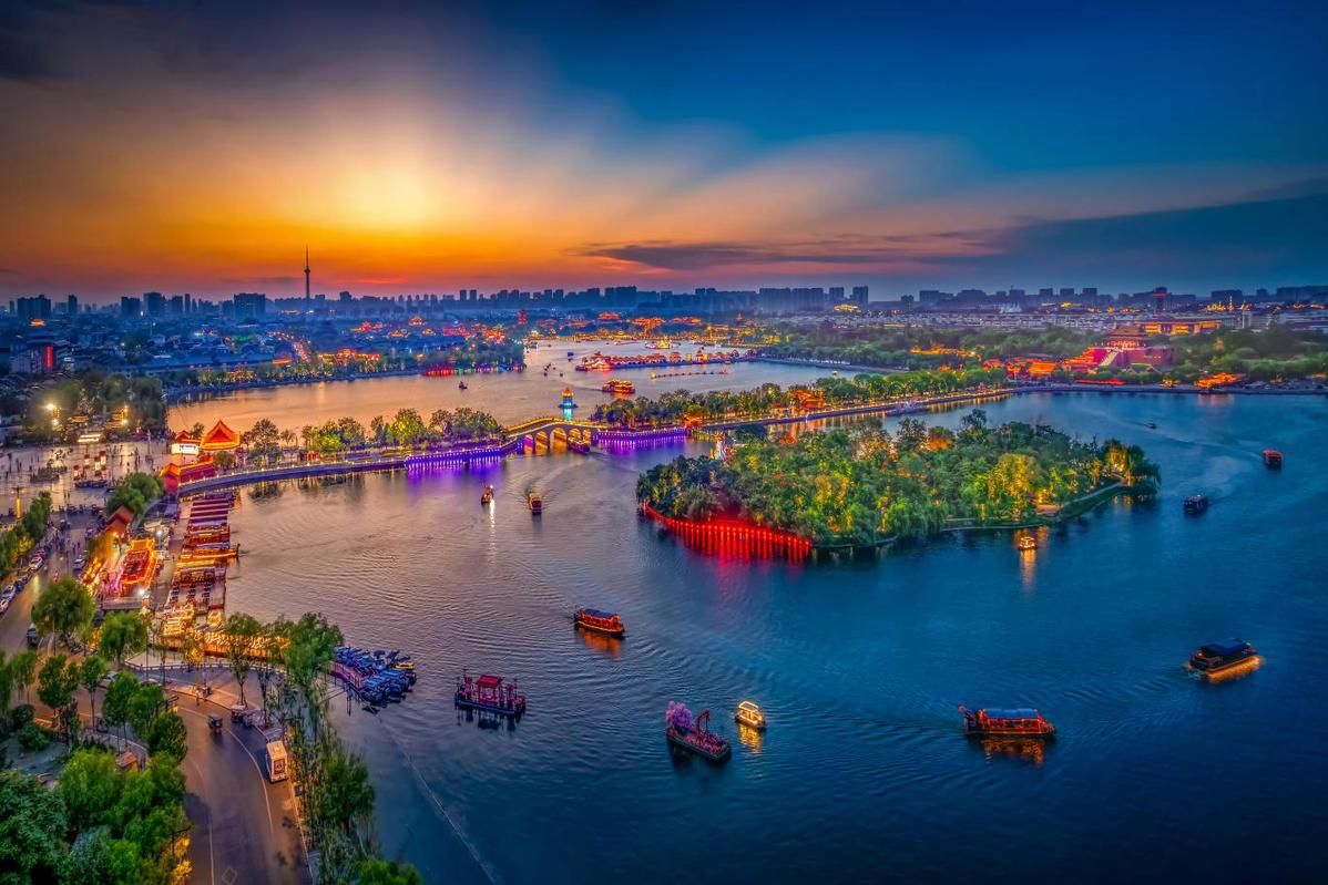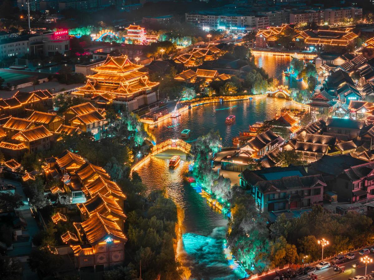而当暮色降临,夕阳为龙亭湖面镀上金光,古典宋韵与现代时尚在此完美交融。入夜的汴河,化身流动的宋韵舞台——龙舟破浪,花船斗彩,佳人水袖翩飞间,入夜,这里便化身为孟元老笔下的东京城。汴河两岸灯火如昼,在光影交织中,历史与当下相拥。千年前东京城的璀璨繁华,此刻正照进现实。一场梦回大宋的实景大秀震撼上演,堪称现实版的“富贵迷人眼”。
