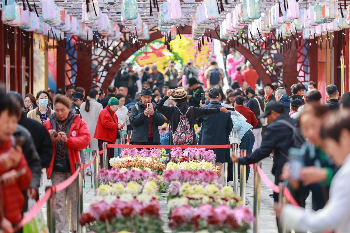 产业格局与未来展区首度披露建设全国首个综合性中国菊花馆的规划愿景,提出“场馆+节庆+产业”三位一体的融合发展策略,为菊花文化的永续传承指引方向。同时,聚焦菊花的现代价值与长远发展,呈现以开封为中心、辐射全国的菊花文化发展路径,解读菊花特性与“汴菊”优质品种,展示科技赋能下菊花在食用、药用及康养等领域的创新成果。(图/姚子文 李新义)
