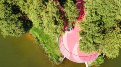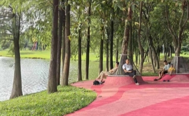 在松山湖的潋滟水光与朦胧烟雨之间,一抹灵动而温柔的粉色悄然绽放。“飞毯”占地380平方米,设计理念源自印象派画家与大地艺术家的漂浮美学。设计团队从三丫坡市民野餐的温馨场景中获得启发,巧妙地将“野餐地毯”这一意象融入地面造型设计,打造出一个连接人、艺术与自然的和谐美丽空间。