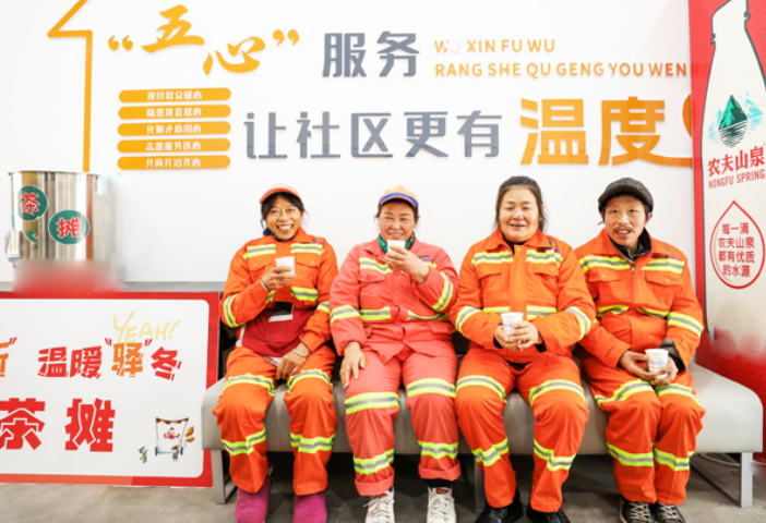 户外劳动者(环卫工人)在阳光驿站喝热茶