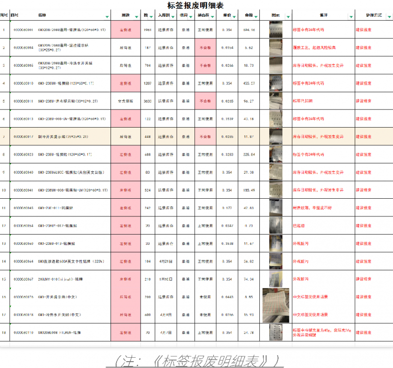 但胡孟蝶很快发现隐患:远泰公司缺乏专项制度,流程对附件要求模糊,仅靠申请信息无法实现闭环管理。她立刻牵头与远泰同事沟通,共同制定《标签报废明细》。这份明细不仅涵盖料号、数量、报废原因等核心信息,更创新性加入物料图片,有效避免识别误差与误用风险,让每一项数据都可追溯。