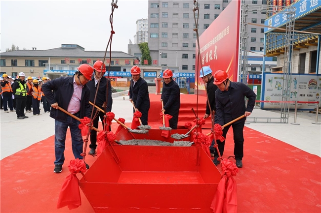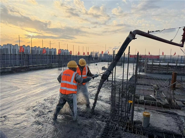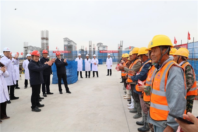 在项目封顶仪式现场,邳州市中医院相关领导宣布“封顶浇筑正式开始”,各参建单位负责人为工程封顶填筑具有里程碑意义的第一锹混凝土,随后深入施工现场亲切慰问了一线作业人员,向他们表示衷心的感谢。