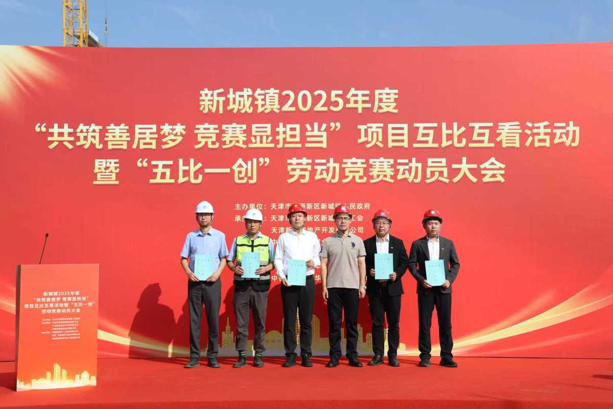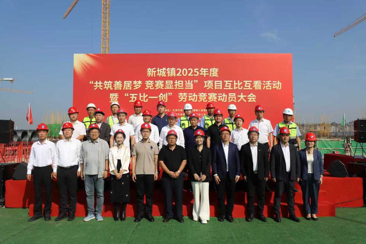近日,新城镇人民政府2025年度“共筑善居梦 竞赛显担当”主题劳动竞赛活动在中建一局华北公司天津棚户区改造03-127地块项目成功举行。天津市滨海新区总工会副主席王广增,滨海新区新城镇人民政府党委书记、二级巡视员王善,副镇长李伟,中建方程华北区域公司党总支副书记、纪检委员、工会主席王军强,天津新南公司党支部书记、总经理王峰,中建一局华北公司副总经理刘登辉,以及各参建单位代表、监理单位代表,约100人参加此次活动。