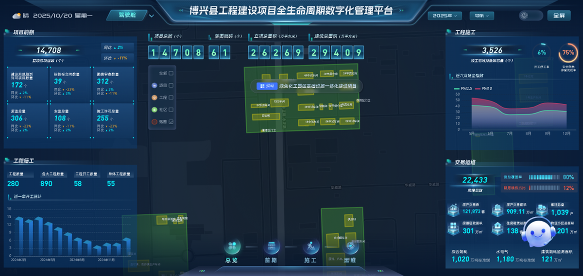 平台推动工程审批系统从单一审批功能向综合管理服务升级,打造多类智能应用场景:一是开发“重大项目服务一张图”,与国土空间规划“一张蓝图”叠加,动态展示72个重点项目位置与进度,实现“一图总览、一屏统管”;二是构建“高效办成一件事”智能申报场景,推出“开工一件事”“水电气暖网联合报装”等服务,实行“一表申请、一窗受理”,大幅提升申报效率;三是建设“智慧工地”数字化监管场景,通过视频监控、环境监测等物联网设备,实现对64个施工现场人、机、料、法、环等关键要素的实时感知与智能预警,推动施工安全监管从被动处置向主动防控转变。